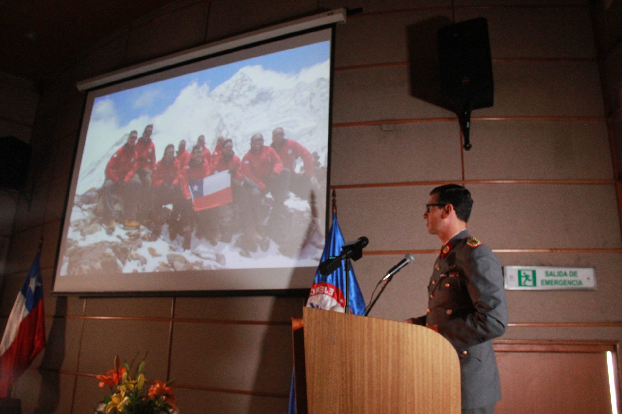 En su conferencia, el oficial se refirió a la Tragedia de Antuco, como un hito de suma importancia que marcó al Ejército, y por el que se realizaron distintos procesos de reflexión, revisión, cambio de doctrina, de sistemas de educación, equipamiento, proyectos, capacitación, entre otros aspectos. “Hubo un crecimiento, pero sobre todo siguieron los desafíos de querer seguir soñando alto en el ámbito de la montaña y es así como nació este proyecto, de alcanzar la cumbre más alta del mundo (8.848 mts), que representa el límite físico de la tierra”.