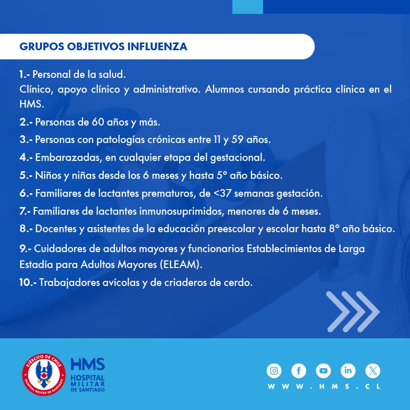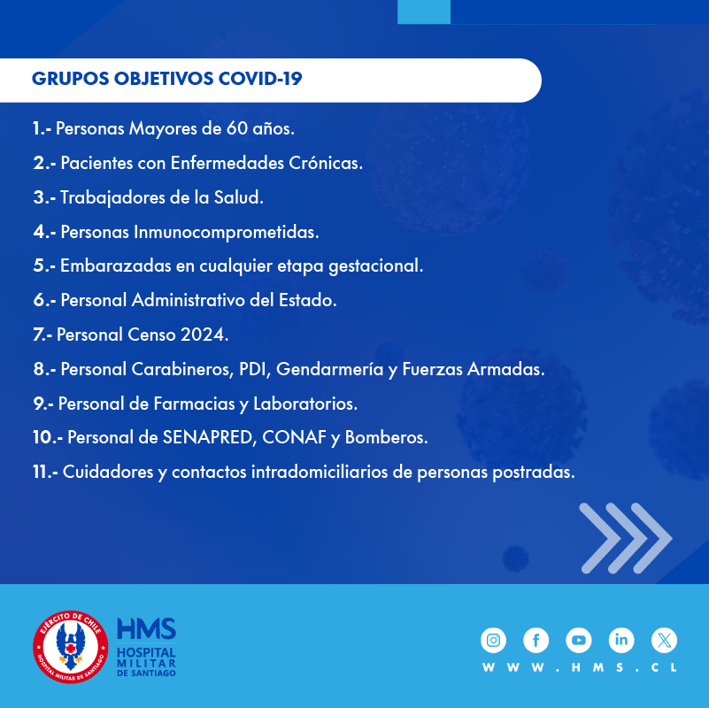 A raíz del aumento en los casos de infecciones respiratorias en las últimas semanas, el Hospital Militar de Santiago (HMS) reitera el llamado del Ministerio de Salud (MINSAL) para que las personas que son parte de los Grupos Objetivos de la “Campaña de Invierno 2024” se inmunicen.