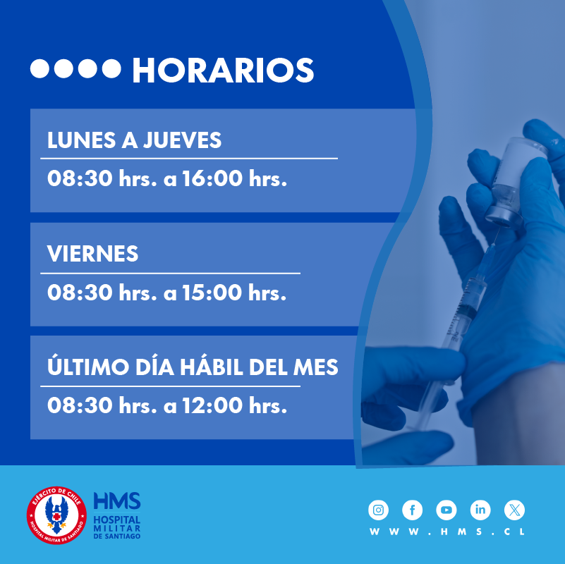 En el “Vacunatorio del HMS” contamos con stock disponible de vacunas contra la Influenza, el Virus Sincicial y Covid-19, así como el personal calificado para administrarlas a todos aquellos que se acerquen hasta sus dependencias, ubicadas en Avenida Fernando Castillo Velasco # 9100 (La Reina).